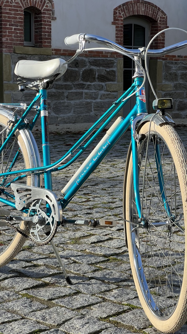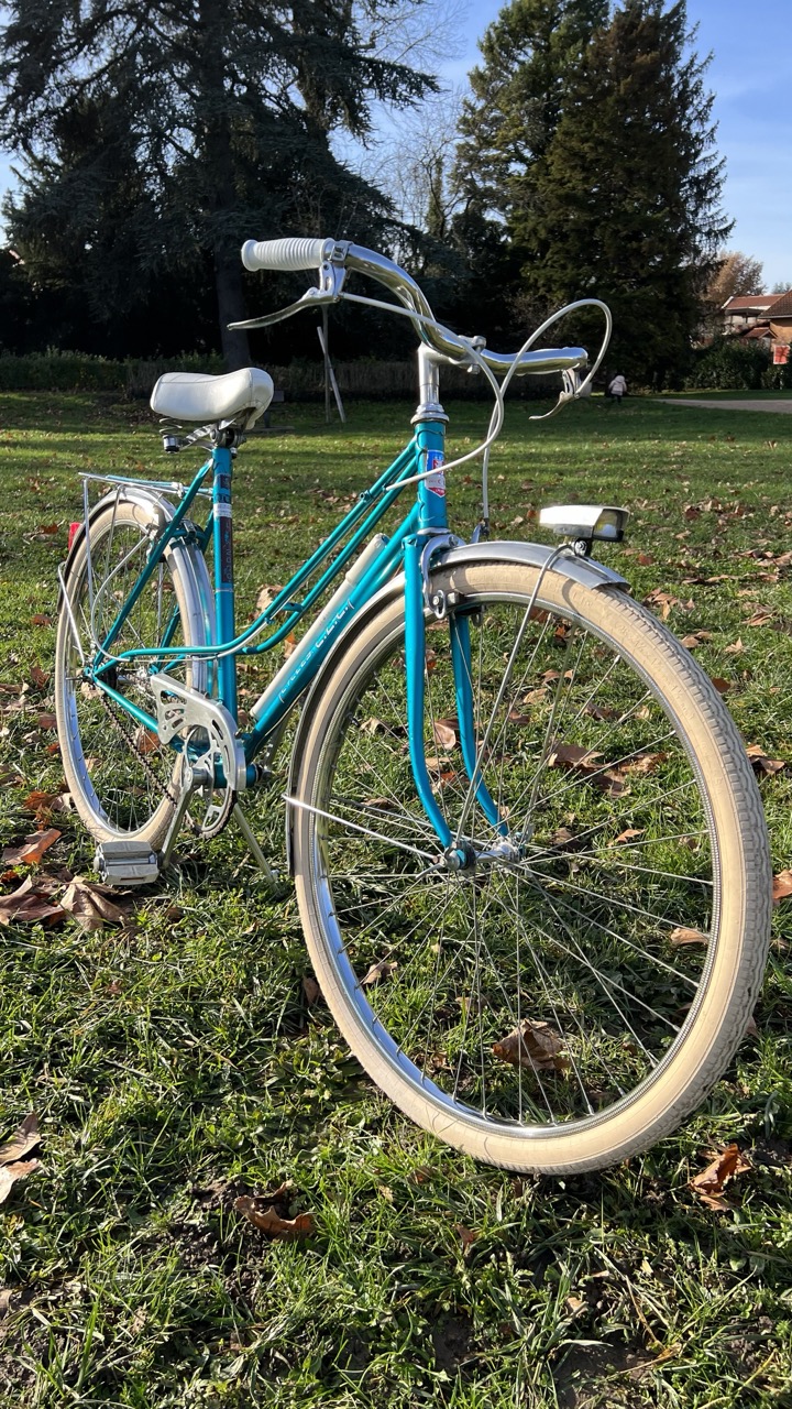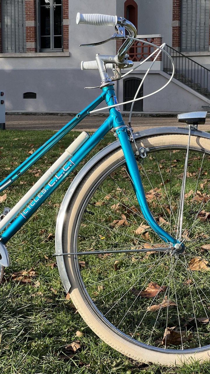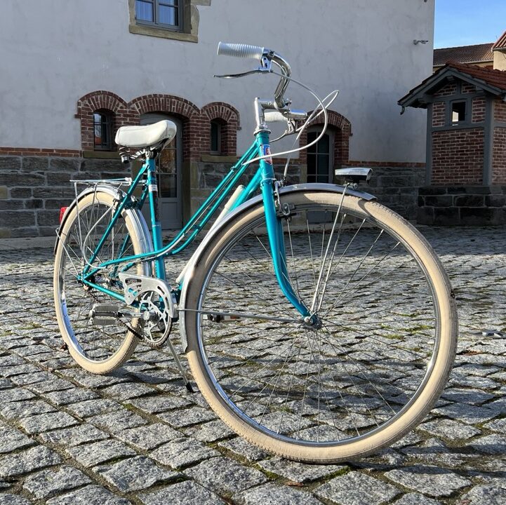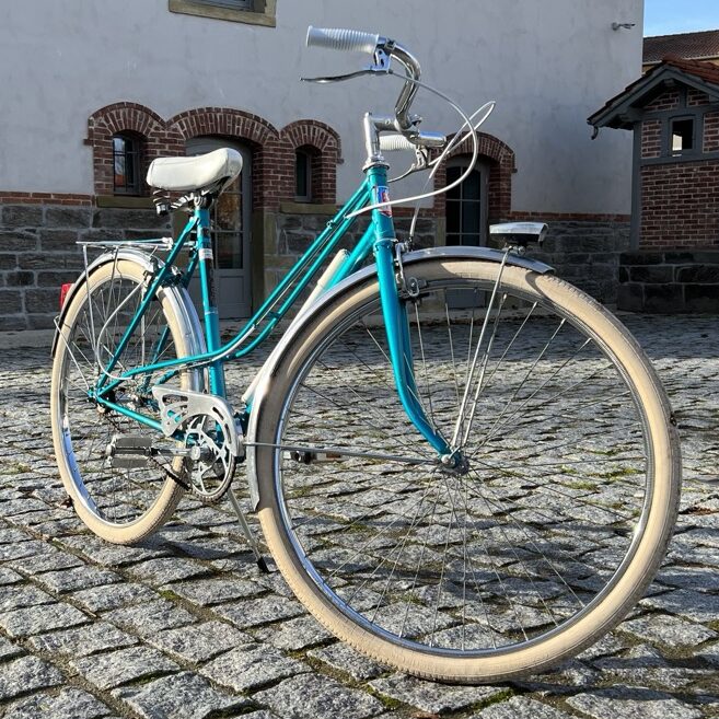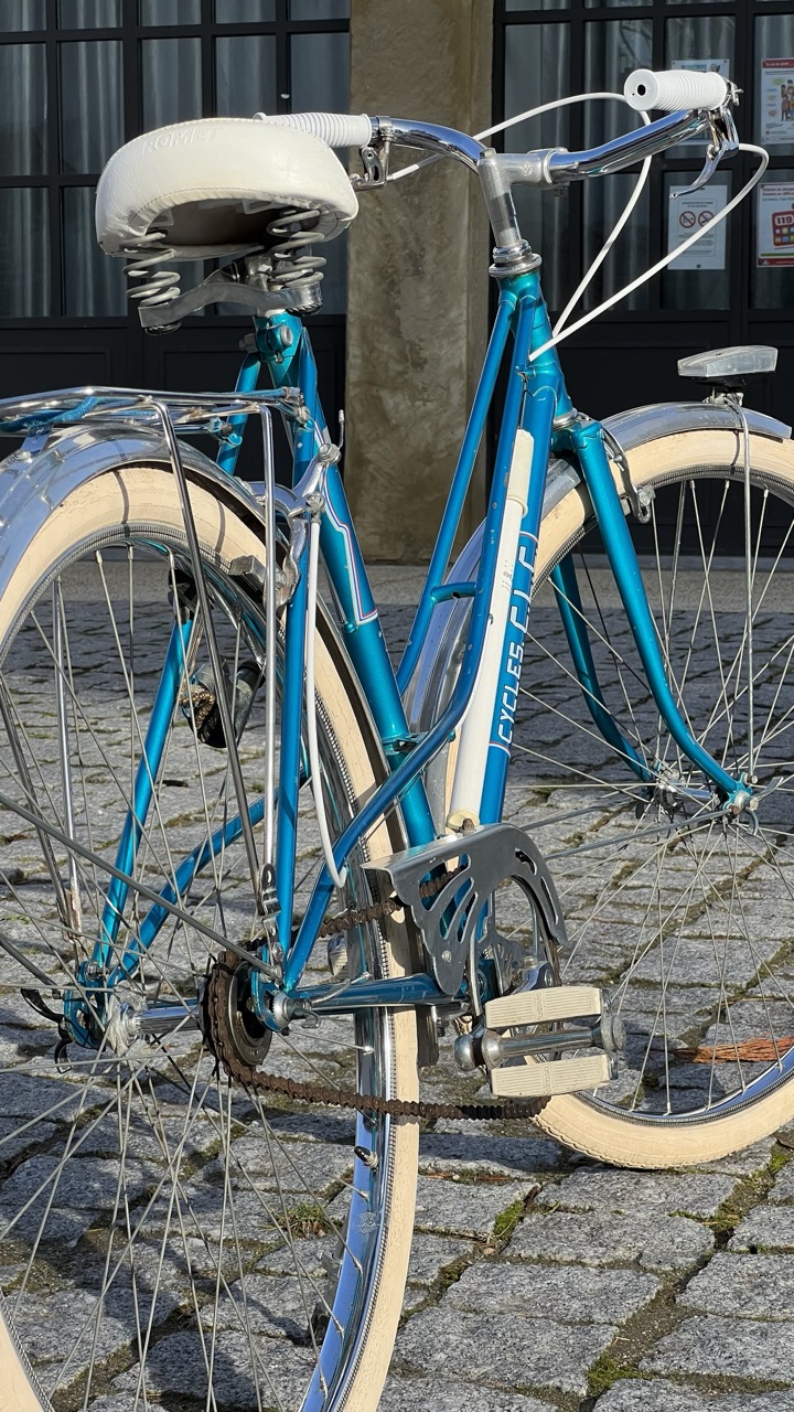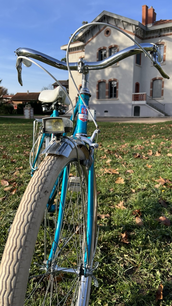 Parce qu’il n’y en avait pas que pour Saint-Etienne. Lyon a eu aussi son heure de gloire en matière de vélo, en proposant des assemblages locaux comme cet bicyclette bleue électrique pour femme.